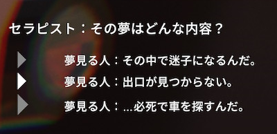 本作におけるゲームパートは散策のみとなっているが、進行に併せてセラピストとの対話がテキスト形式で随時展開していく。