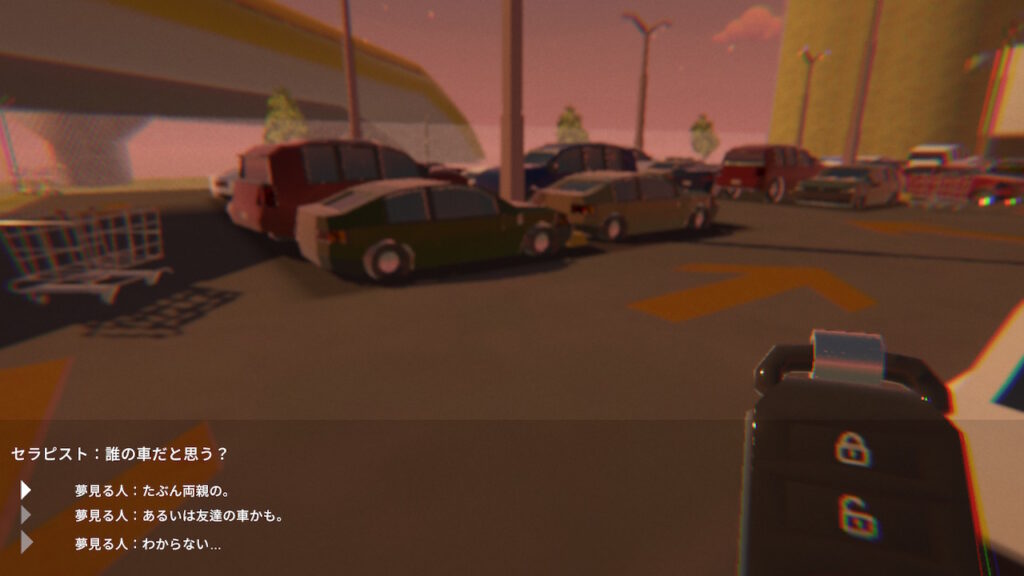一人の夢を見る人物の視点となり、セラピストとの対話と並行しながら夢世界の駐車場をひたすら散策する―、本作「A Dream About Parking Lots」はそんなルールを伴う何とも奇妙なウォーキングシミュレーターだ。