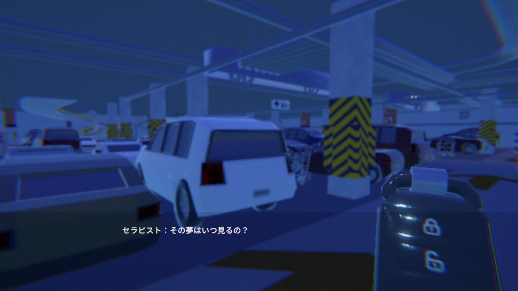 本作は一人称視点で展開するウォーキングシミュレーター。プレイヤーは夢見る人物の視点となり、セラピストとの対話と並行しながら駐車場が舞台の夢世界を彷徨い続けていく。
