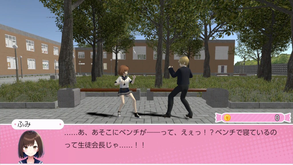 先輩に追い付いた後は舞台が中庭や教室へと移り、文と翔馬二人きりによる交流パートへと切り替わる。