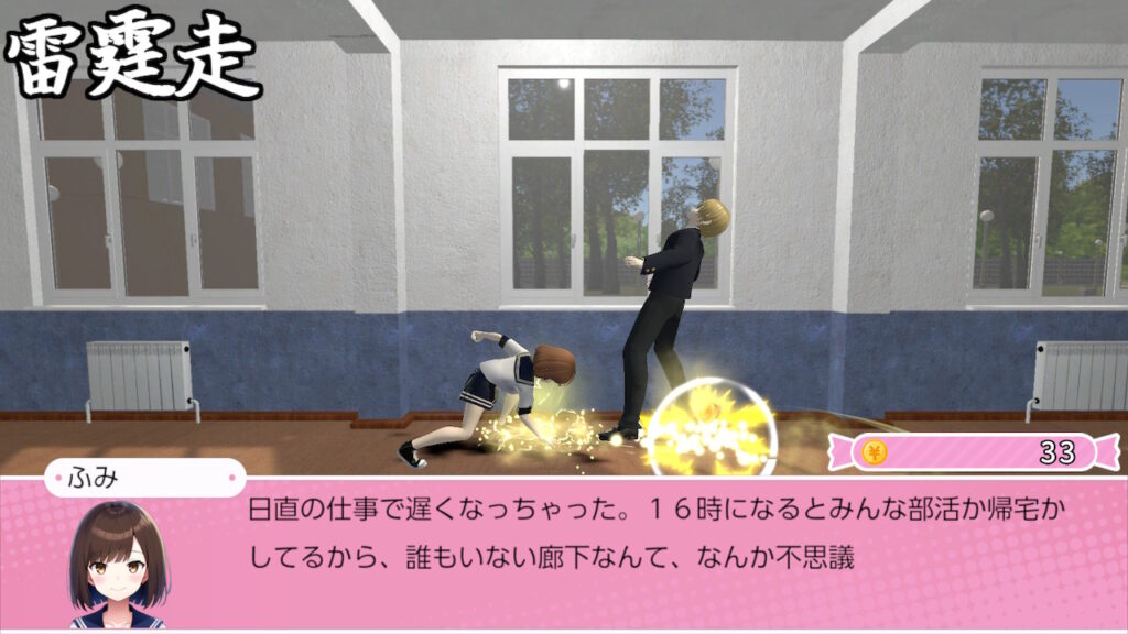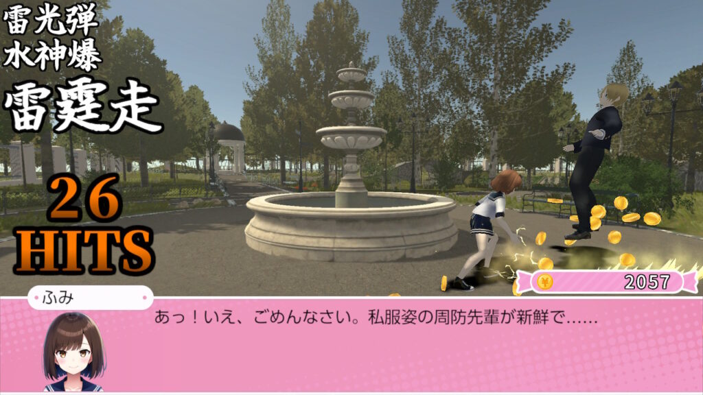 パンチやキック、各種必殺技といったフィジカルな技を駆使して翔馬を攻撃することで、打数に応じた額のお金(単位は¥)が支給される。なお、本パートでの翔馬自身は文との会話は行う反面、移動や攻撃は一切してこないサンドバッグのような役割に徹するスタンスとなっている。