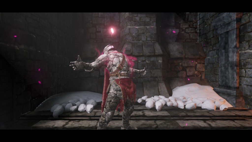 そのため、ライフゲージの境界が行ったり来たりを繰り返すような状況に一旦陥ってしまうと立て直しが難しく、石化の呪い発動効果の影響で折角拾った予備武器を落とす機会が多くなってしまう傾向にある。いかに次のチェックポイントまでライフゲージを持たせるかが最重要課題であり、そのためには回復用のジェムを素早く連続で回収しながら細々と食い繋いでいくしかない。