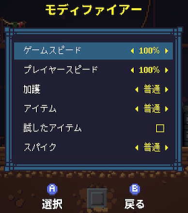 「モディファイヤー」ではゲームスピードやアイテム、加護、スパイク(トゲ罠)の出現率など、ゲーム全体の設定を細かく変更することができる。ただし、「モディファイヤー」を含め「カスタムモード」をオンに設定した場合は、チャレンジや実績、アンロックの獲得、ランキングへの登録は無効となってしまうので要注意。