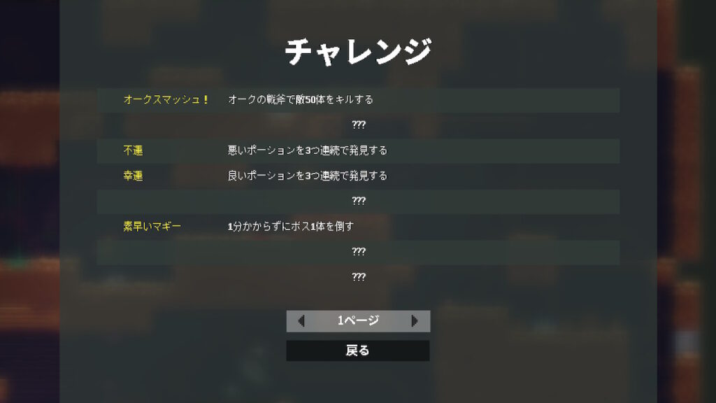 条件内容の大半は「???」となっているものが多数を占めるが、これらはチャレンジ内容にまつわるアイテムや敵の発見によって判明する仕組みとなっている。