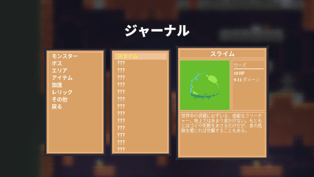 モンスター、アイテム、加護などのダンジョン内で新たに発見した各情報は、タイトルメニューやポーズメニュー内の「ジャーナル」に詳細が記載される。