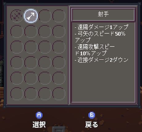 筆者のオススメは弓矢2本同時射出効果を恒常で得られるようになる「倍返し」。初期装備から近接武器が消えるため、敵の出現構成次第で何か1つ確保するまでの間は少し厳しい局面も見られるが、本作においては遠隔武器の重要度が極めて高い。
