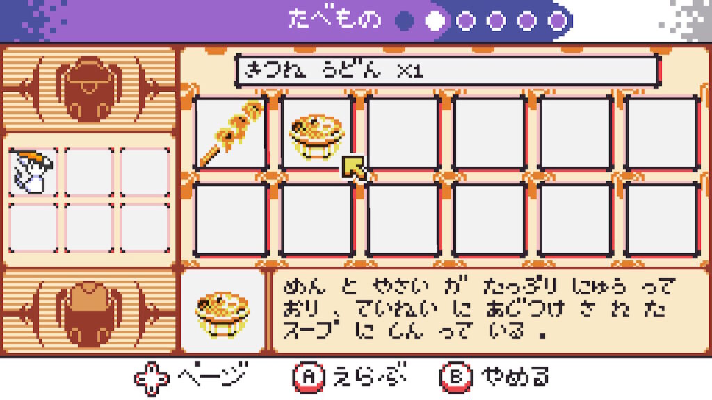 各アイテム選択時は下部のテキストボックス内に説明文が併せて表示されるが、現状では低品質翻訳によるひらがな表記につき中には少々読み辛いものも。言語を日本語に設定している場合、回復アイテム各種の説明文で回復量を示す部分が何故か抜け落ちているといった欠陥も見られる。