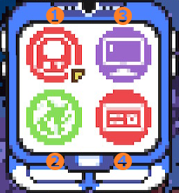 | ❷:地図を開く。起動直後にはクエストの達成履歴と進行状況が表示される。 | ❹:レンジャーIDを表示。主にプレイヤー名、所持金(単位はドッツ)、所持モンスター数、プレイ時間、現在の編成を確認可能。 |