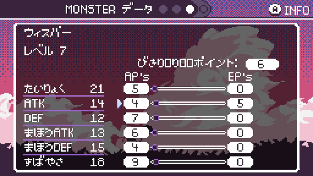 各モンスターにはたいりょくやATKなど計6種類のパラメーターが存在しており、レベルアップ時に獲得できるポイントを各項目に割り振る事でEP(Experimence Point。経験値の意)がチャージされる。振り分けたポイント1つ辺りEPは5ずつ上昇し、該当パラメーターに上乗せで補正がかかる。EPに一旦注いだポイントは自由に振り直すことも可能となっている。