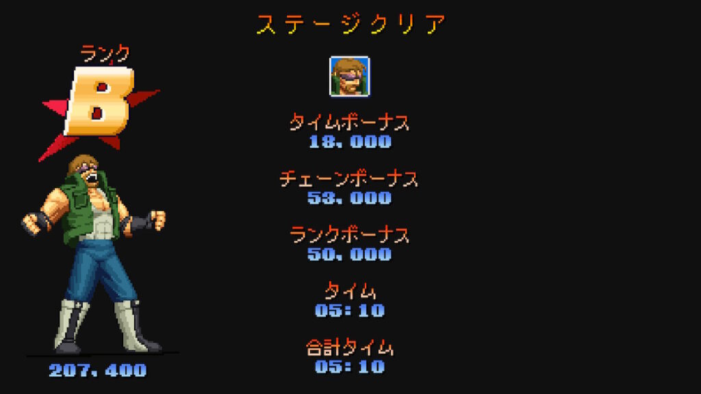 各ステージのボスを倒すとステージクリア時のリザルトが表示される。