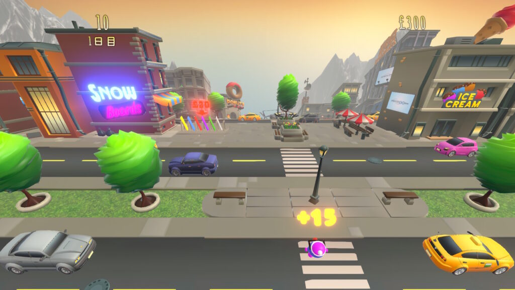 自動車に接触せず道路を渡ることに成功した際の基本スコアは1台追加毎にプラス15点。そこに日数を乗算した分の合計が最終的な得点して加えられる。(例:3日目をプレイ中、4台目の自動車を回避した際の加算ボーナスは15(基本点)×4(回避台数)×3(日数)で180点となる)