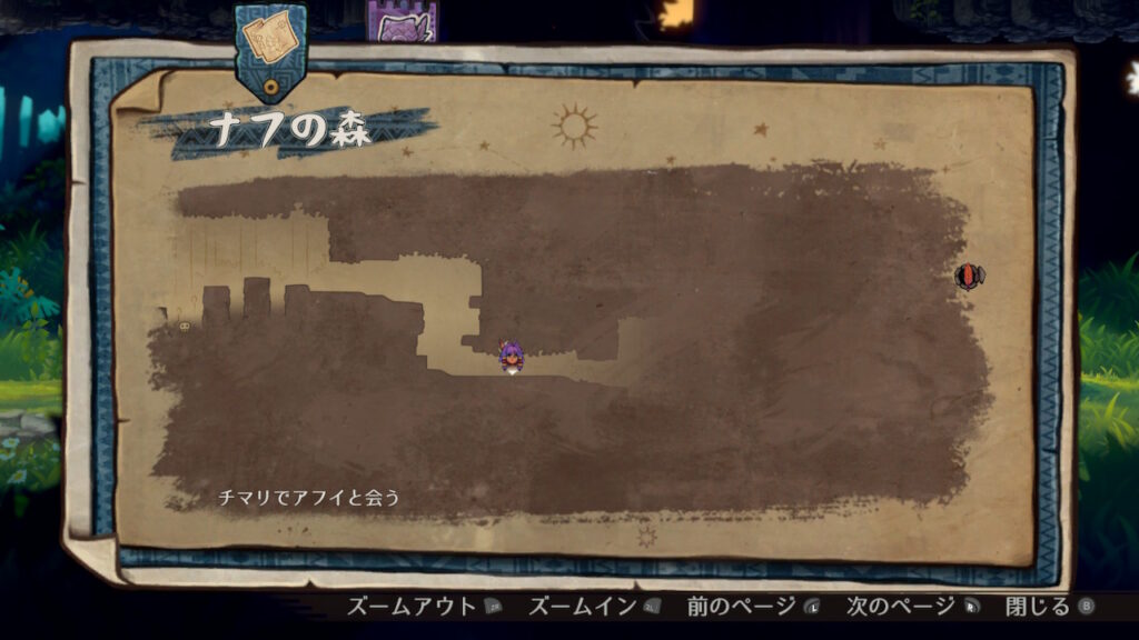 プレイ中、-ボタンで地図を開くことができる。地図はズームイン/アウトに対応しており、ZRで拡大、ZLで縮小が可能。💀マークは落ちたらミスとなるポイント、赤い羽根のアイコンが次の目的地を示すマーカーを示している。