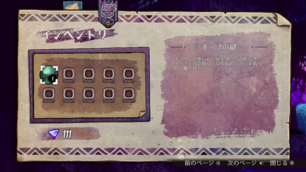 また、同メニューはインベントリメニューと繋がっており、LもしくはRボタンで切り替えが可能。インベントリメニューで行えるのは所有するアイテムや通貨額の確認のみで、アイテムには最大で10のスロットが用意されている。