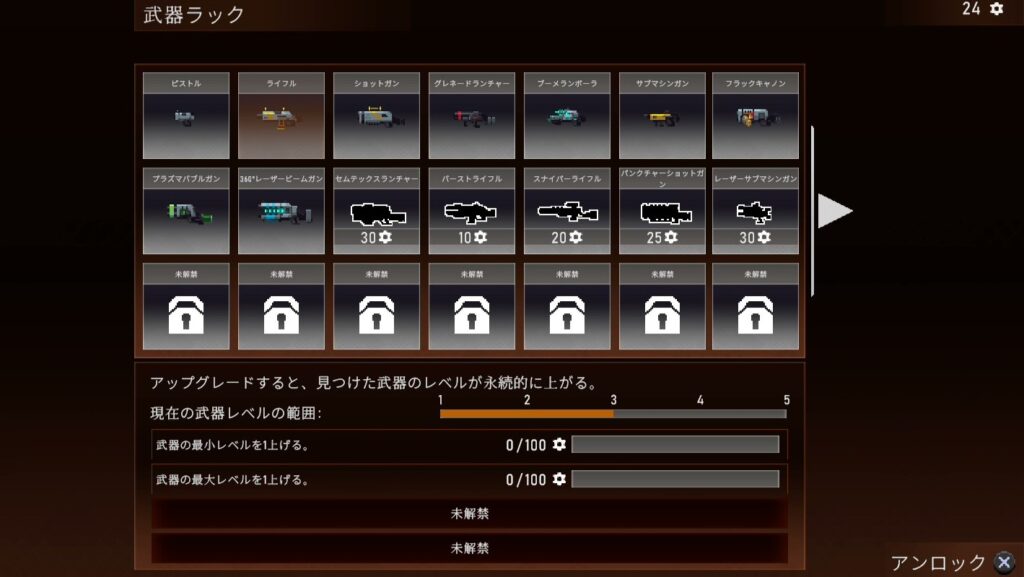 ロック状態の武器はゲーム中に入手した歯車を消費することでアンロックすることができる。