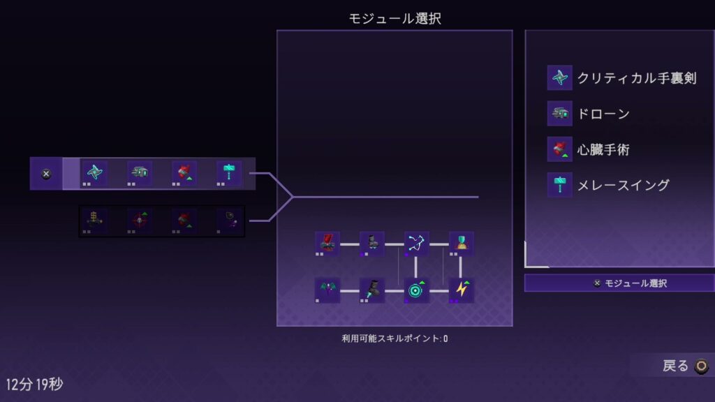 スキル追加は4つのスキルで構成されたモジュールを選択する方式になっているため、ある程度プレイヤーの選択できる余地はある。