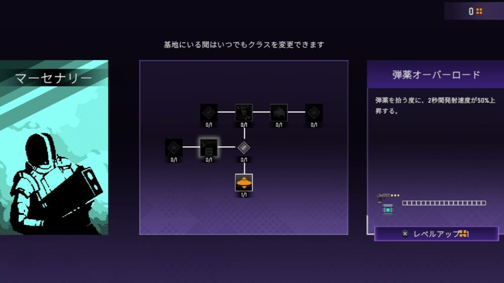 ステージ内でアイテムとして入手したスキルポイントを消費してスキルの取得・強化を行う。