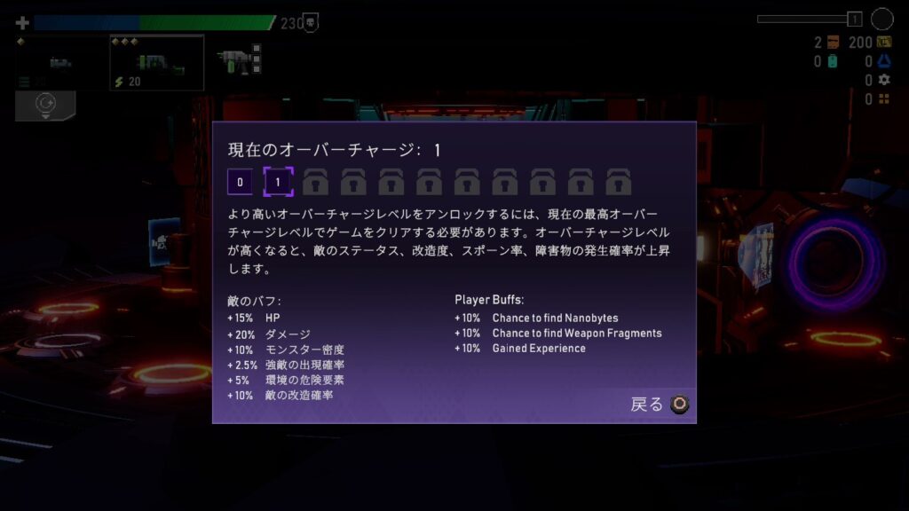 オーバーチャージを設定した状態でゲームをクリアするとより高レベルのオーバーチャージが解放される。