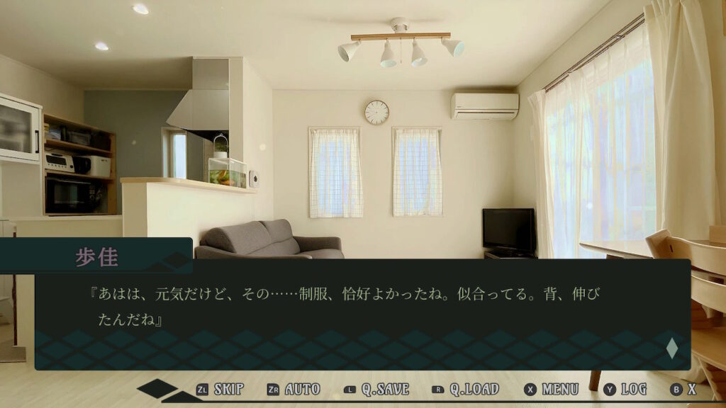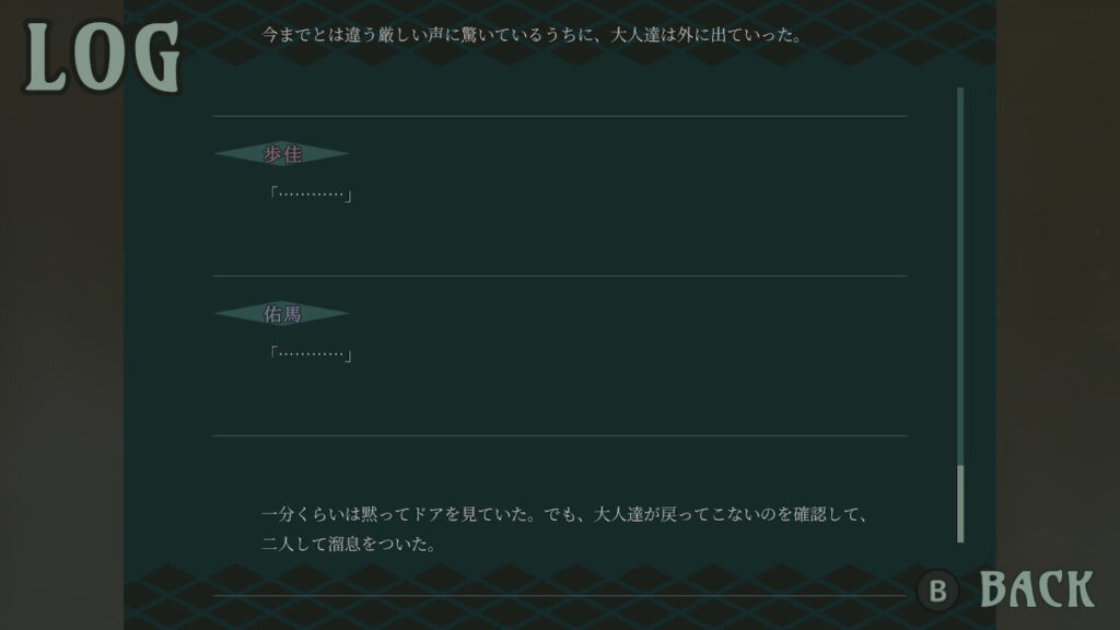 ゲーム進行中、Yボタンを押す事でバックログを確認することができる。Lスティックの上下(携帯モードの場合はスワイプでも代用可)で、一段落ずつスクロールして表示されるようになっている。