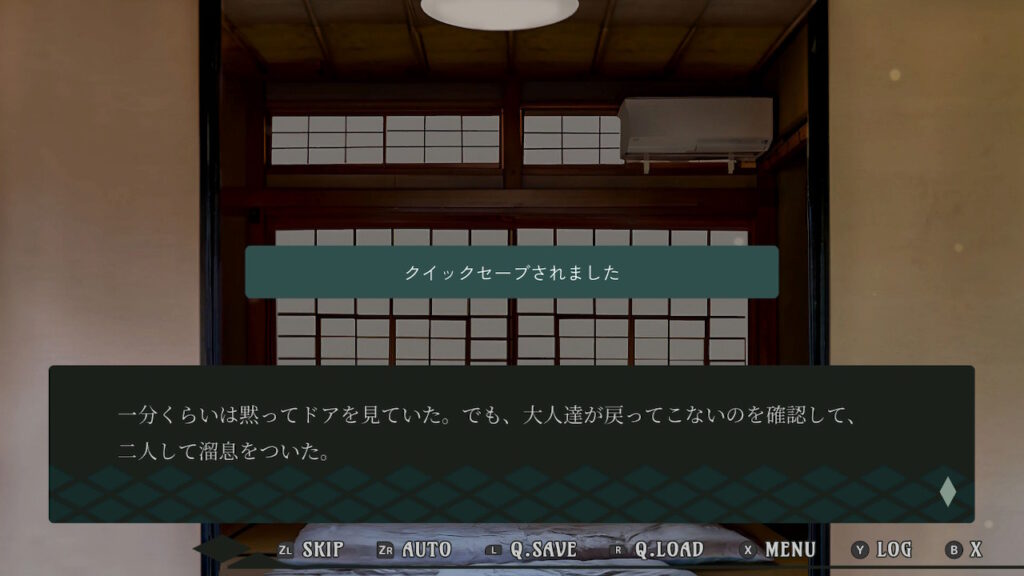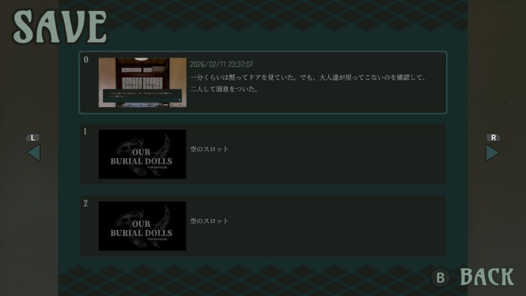 同じくゲーム進行中、Lボタンではクイックセーブ、Rボタンではクイックロードを実行できる。