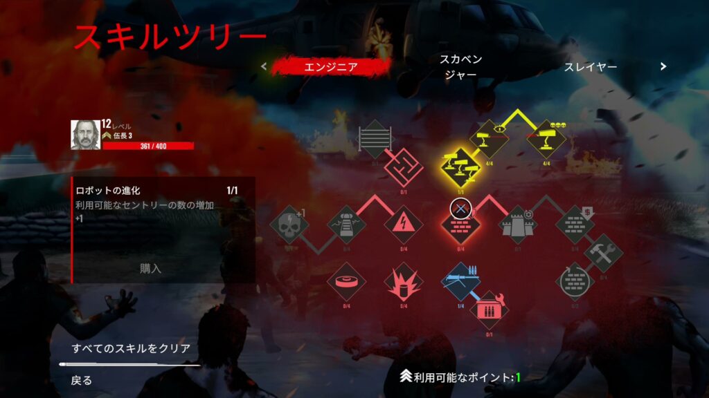 | スカベンジャー | $(ドル)の入手量増加や武器・弾薬の値下げ、即死回避など粘り強いプレイを可能とするスキルを習得できる。 |