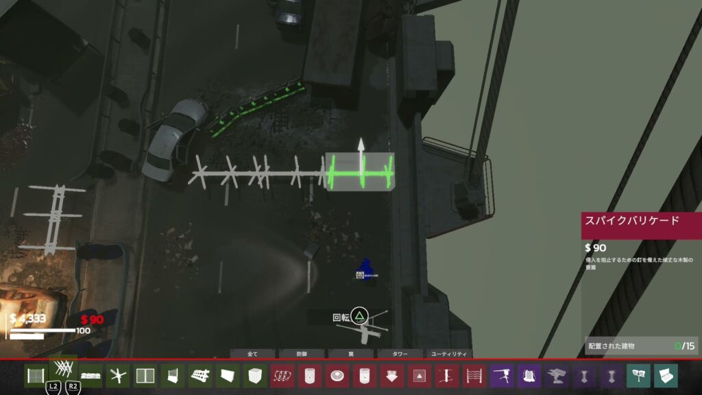 $(ドル)を消費してバリケード(尖った木の杭、コンクリートの壁など)や地雷、銃座、セントリーガン(自動射撃兵器)などを組み合わせた防衛施設を構築する。