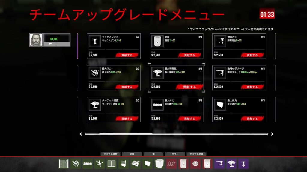 武器や防御施設のアップグレードは$(ドル)を消費して行う。