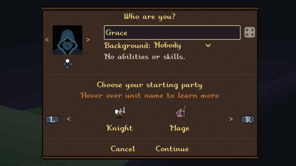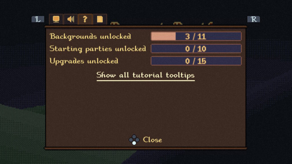 作中ではゲームのプレイ状況に応じて、プロフィール作成時の出自(Backgrounds)、ゲーム開始時の編成(Starting parties)、新たなアップグレード(Upgrades)のそれぞれが段階的にアンロック可能となっている。