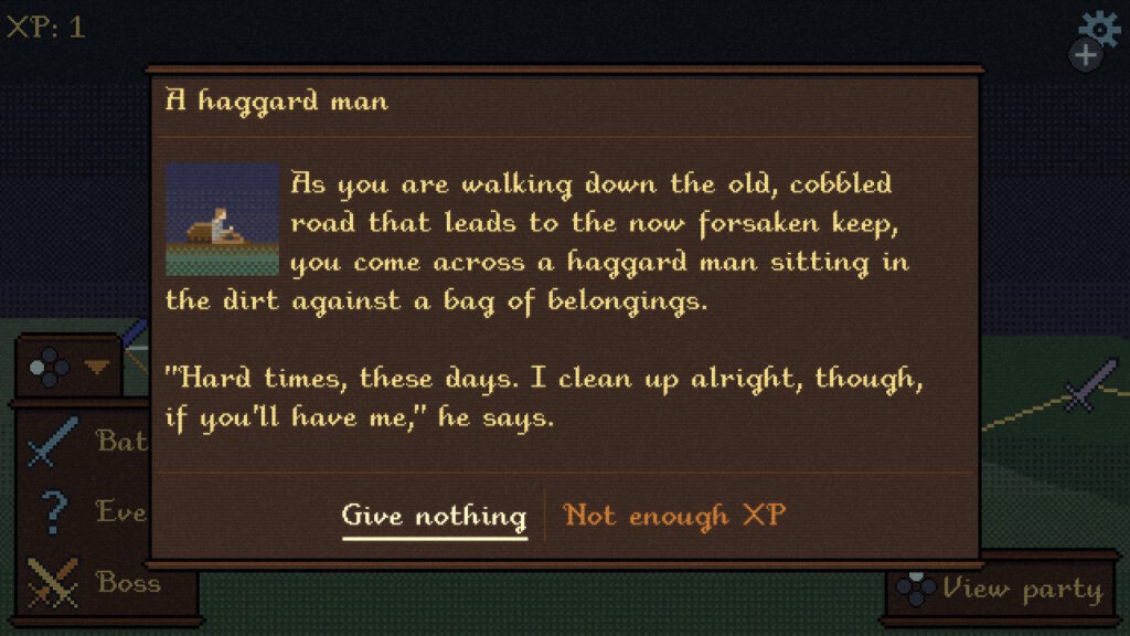 今は廃墟となった城塞へと続く古い石畳の道を歩いていると、荷物の詰まったバッグを抱えて土の上に座り込むやつれた男に出会う。 「ここ最近は大変なんだ。でも、もしよければ、ちゃんと掃除はするよ」と彼は言う。 何も与えない | 経験値が足りない |